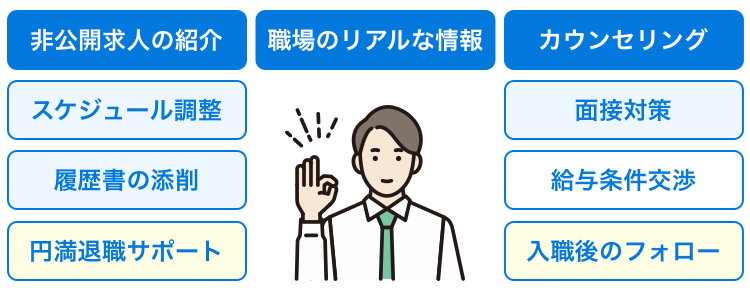 あなたの希望にぴったりの職場・求人を探してくれる、頼れるパートナーです。一人で悩まないで、なんでも転職のプロに相談してみましょう。